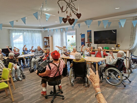 Da unsere „Musikantin“ Frau Spahr „etwas früher“ bei uns vorbeischaute, begrüßte diese schon einmal die Bewohner vom Pflegeheim mit lustigen Melodien auf ihrem Akkordeon. Als die Bewohner vom Kleeblatt-Wohnen pünktlich eintrafen, nahm das Oktoberfest seinen Lauf. Sobald die Bewohner die Lieder erkannten, sangen sie sogleich mit, wippten im Takt oder schunkelten. Frau Spahr in ihrer feschen Lederhose, rollte mit ihrem „fahrbaren Untersatz“ von Tisch zu Tisch, um auch alle Bewohner mit einzubeziehen. Zwischendurch wurden verschiedene „Volksfestgetränke“ angeboten, bevor es mit ein paar lustigen Bewegungsrunden weiterging. Zudem wurde noch ein Jodelwettbewerb abgehalten und es gab danach fünf glückliche Gewinner, die ein Lebkuchenherz als Preis erhielten. Frau Spahr erzählte noch ein paar Kalauer, um danach wieder Schlager, Volkslieder oder ein paar Evergreens zu spielen. Da der Nachmittag nun zu Ende ging, wurde das letzte Zugabe-Lied mit Frau Spahr gesungen. Der Sozialdienst verabschiedete Frau Spahr und nach einem langanhaltenden Applaus gab es nun leckere Weißwürste, Laugenbrezeln und Rettichsalat zum Abendessen.