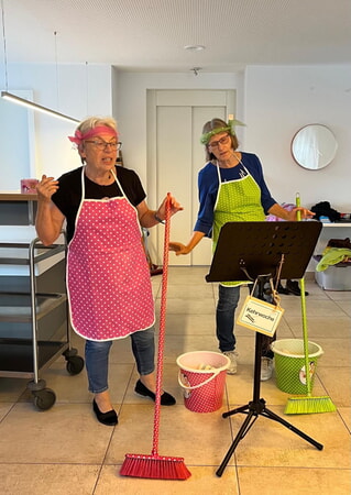 Die beiden haben auf unterhaltsame Weise präsentiert, woher das Wort „Kehrwoche“ stammt, mit welchen Besen und Putzmitteln früher geputzt wurde und welche Schürzen man zu welchem Anlass getragen hat.