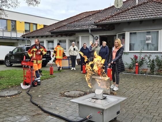 Am Mittwoch in der vergangenen Woche trafen sich die Mitarbeiterinnen und Mitarbeiter aus dem Rathaus und dem Bauhof zur gemeinsamen Brandschutzunterweisung auf dem Gelände der Freiwilligen Feuerwehr in Erligheim. Bauhofleiter Grill führte durch die Theorie und vermittelte viele Tipps mit anschaulichen Videos. Im Anschluss versammelten sich alle Teilnehmer vor dem Feuerwehrhaus zum praktischen Teil und durften mit dem Feuerlöscher einen Brand löschen. Vielen Dank an Herrn Grill und seinem Bauhofteam für die Vorbereitung und Durchführung der Übung.