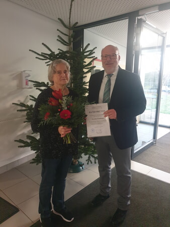 Bürgermeister Schäuffele gratulierte in der vergangenen Woche der langjährigen Mitarbeiterin Nevenka Schillinger zum 25-jährigen Dienstjubiläum am 27. November 2025 und überbrachte die Dankurkunde und einen weihnachtlichen Blumenstrauß. Frau Schillinger ist als Reinigungskraft im Kinderhaus beschäftigt, vielen Dank für die lange Zeit.