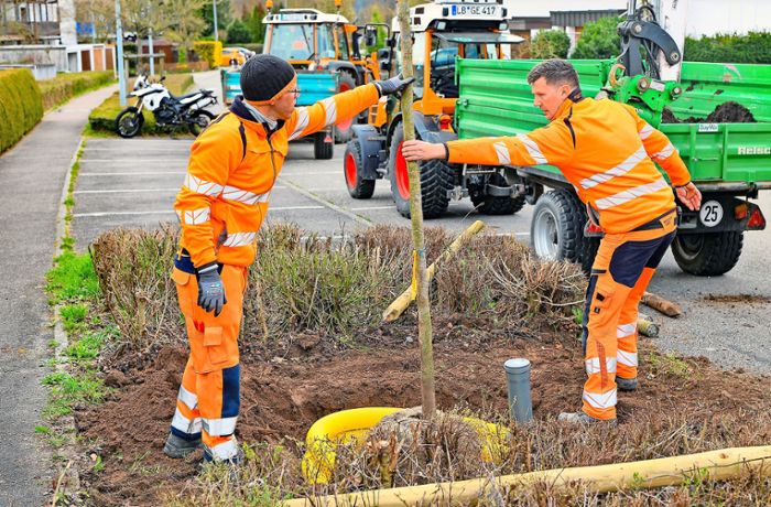 Elf bis zu vier Meter hohe Laubbäume wurden im März von den Bauhofmitarbeitern im Gemeindegebiet gepflanzt, zehn davon waren ein Austausch von beschädigten oder kranken Bäumen. Vor dem Rathaus wurde die kranke Linde durch eine italienische Erle ersetzt. Die mediterrane Variante des Erligheimer Wappenbaums wurde nach umfänglicher Diskussion im Gemeinderat ausgewählt, da diese kein „so großer Wassersäufer“ sei. „Wir haben insgesamt Bäume ausgewählt, die das Stadtklima gut vertragen und trocken- wie auch Streusalzresistent sind“, erklärt Bauhofleiter Grill im Gespräch mit der BZ.